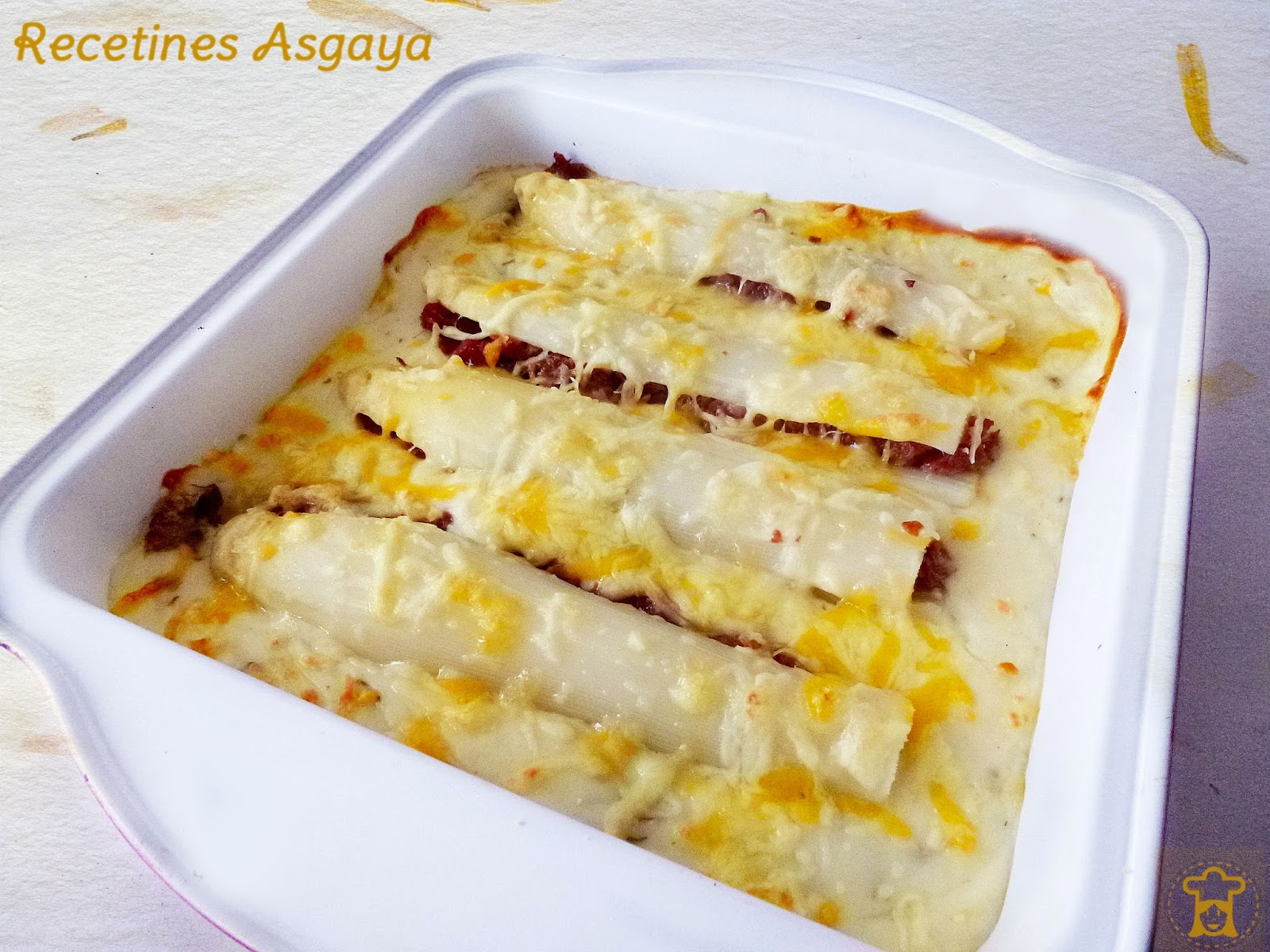 Poner los espárragos rellenos sobre la fuente con bechamel. Por último, cubrimos con queso rallado al gusto y horneamos durante 10-12 minutos a 200ºC.